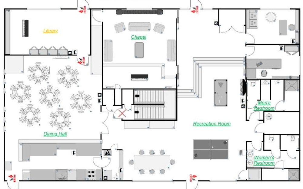 Recreation Room: seats 65, has tv with HDMI connection, fire place, gaming devices that may be moved/stored as needed, dining table, and access to restrooms.